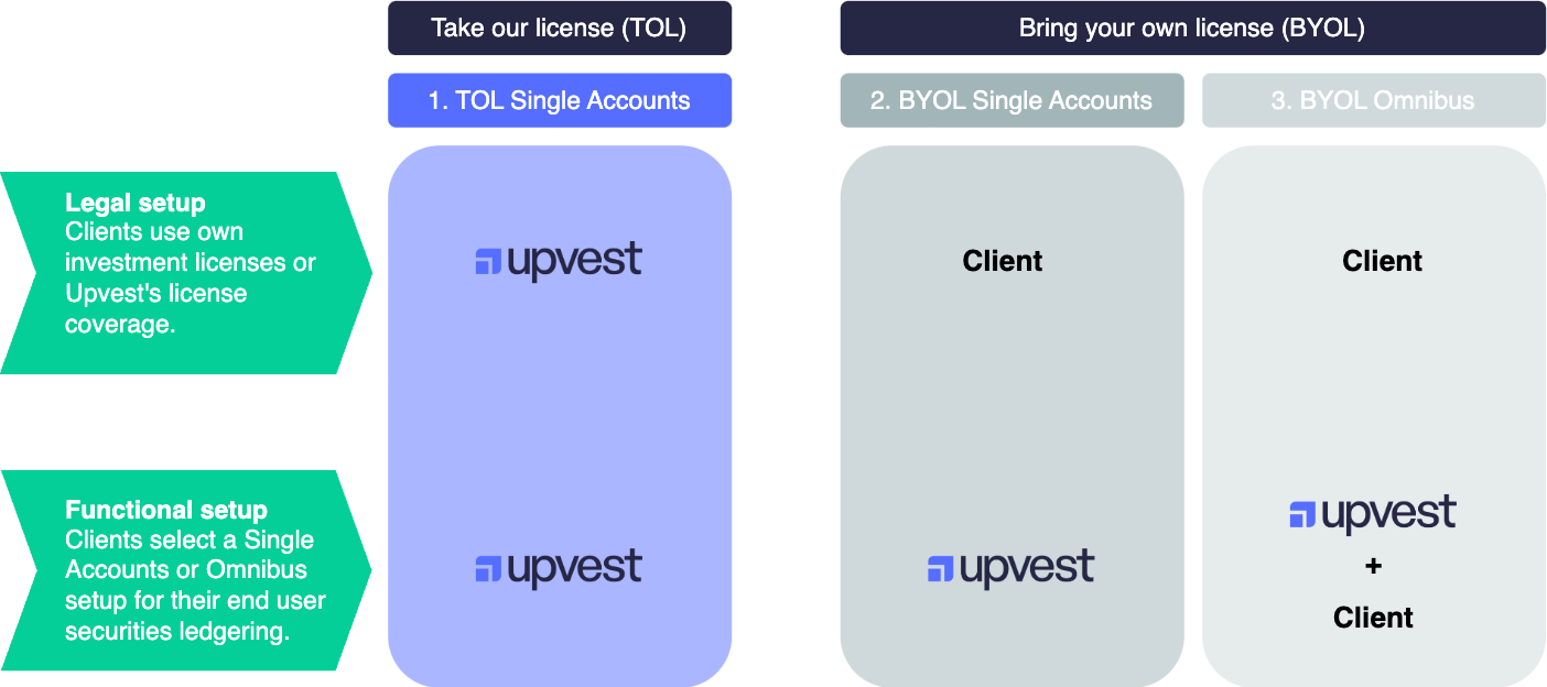 Operating models are the framework that describes how Upvest operates and delivers its products and services. When you build a solution with the Upvest Investment API, you will be doing so within the framework of one of our operating models.