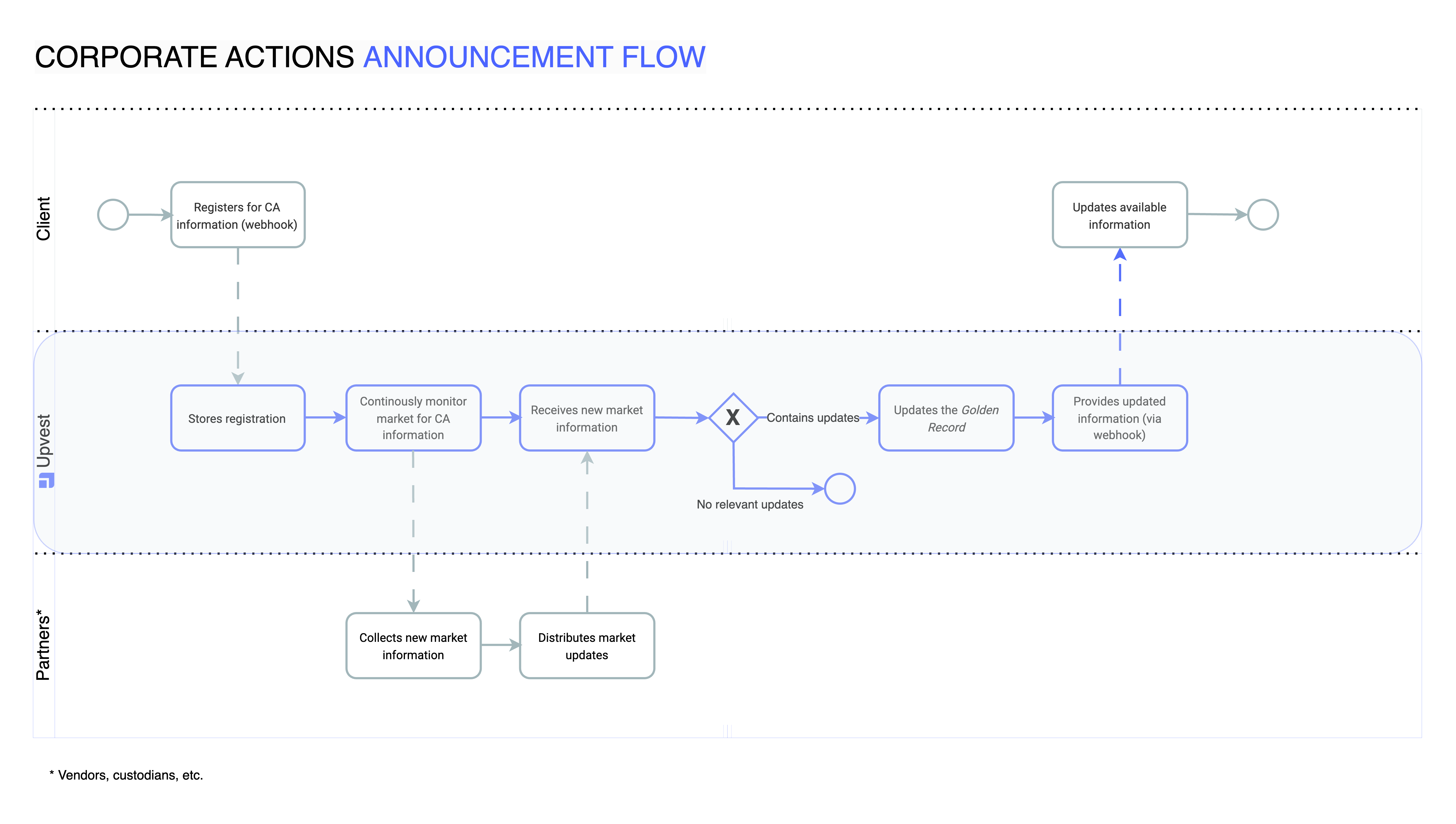 Upvest offers the possibility to inform the client about upcoming corporate actions promptly after their announcement. To this end, announcements are processed and manually reviewed by Upvest's operations teams and distributed within 24 hours of initial receipt.