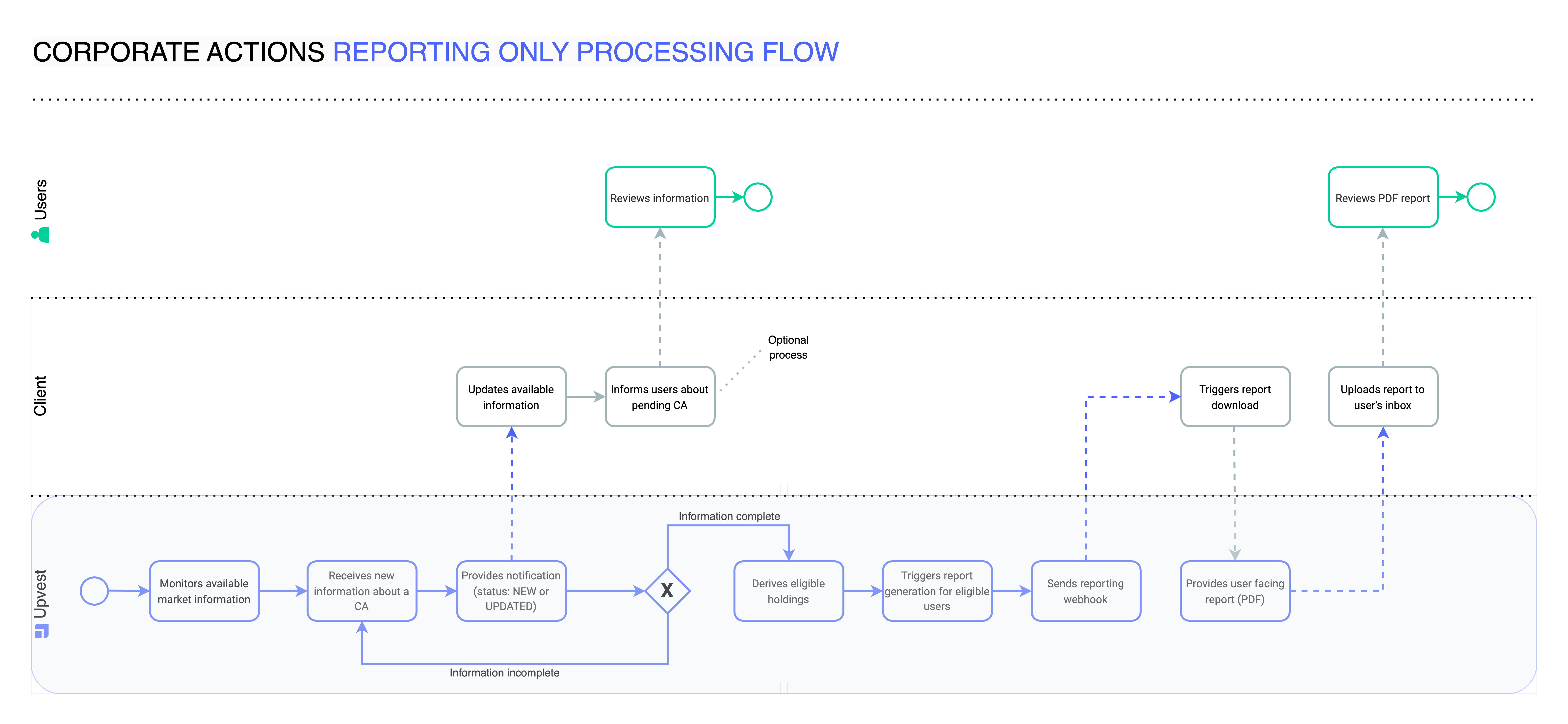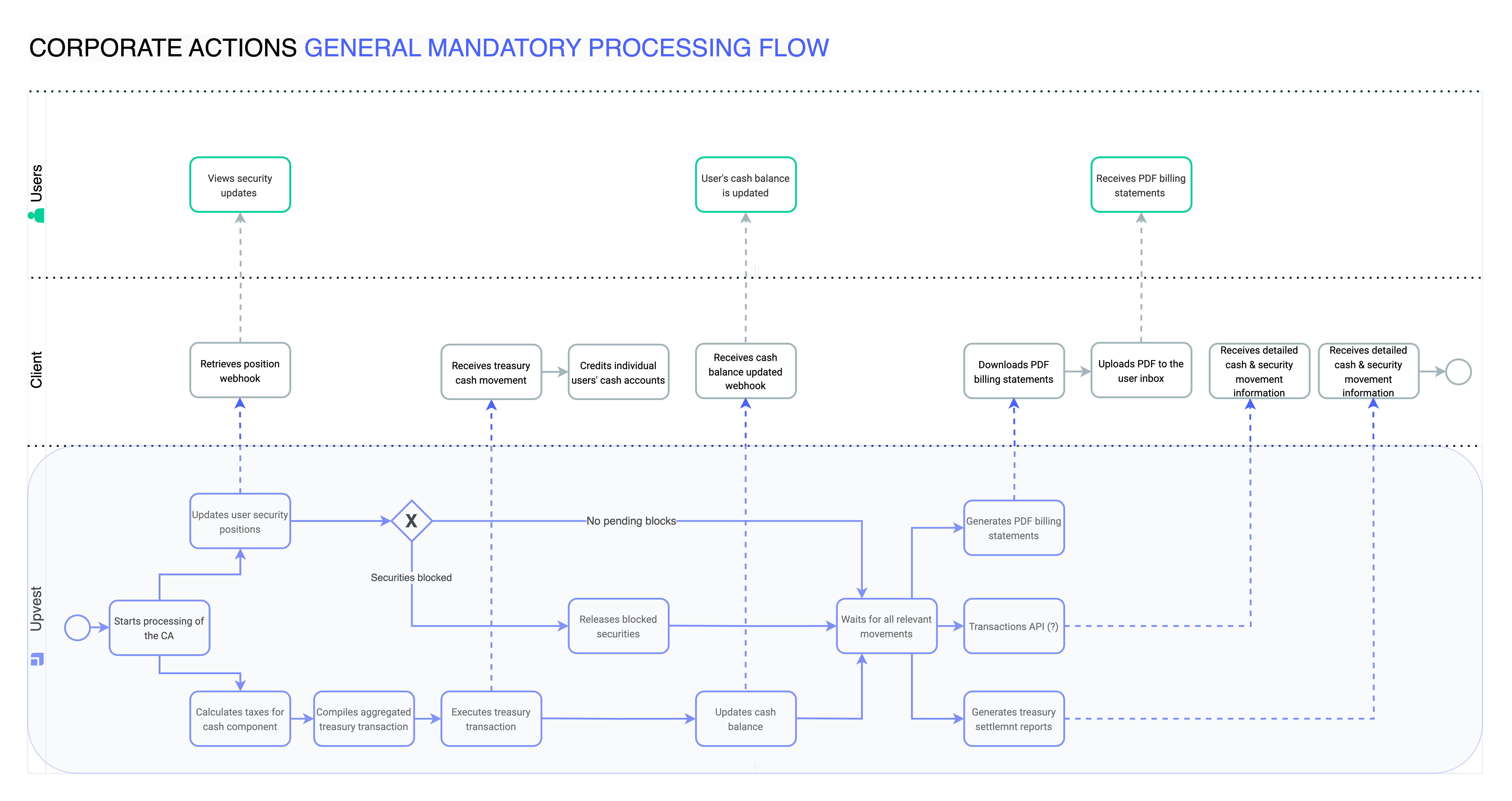 The following diagram outlines the entire process for mandatory corporate actions and the points of contact with the client via the Investment API: