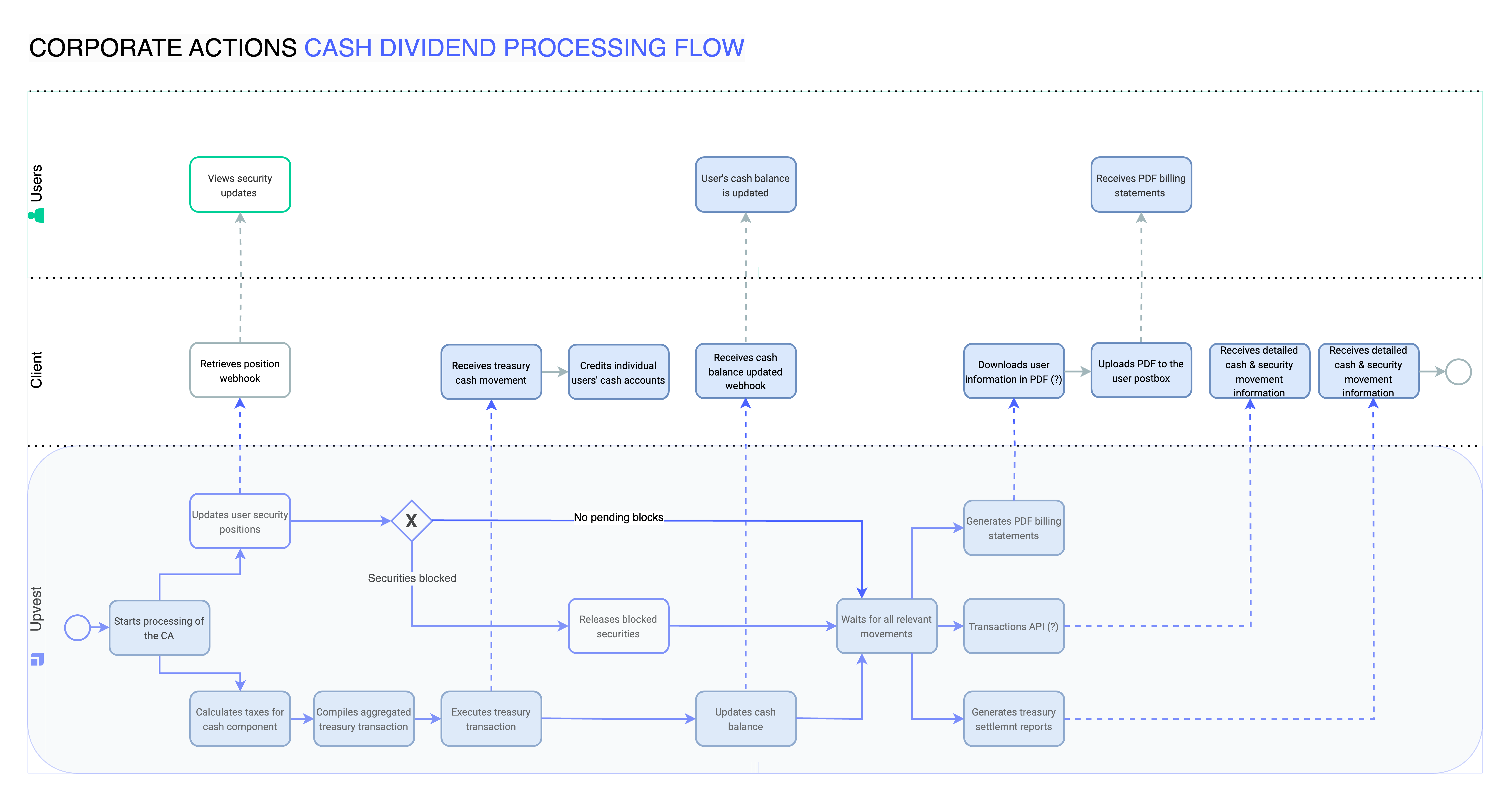 In this section you will find a concrete example of the most common corporate action - the cash dividend - and the associated process diagram.