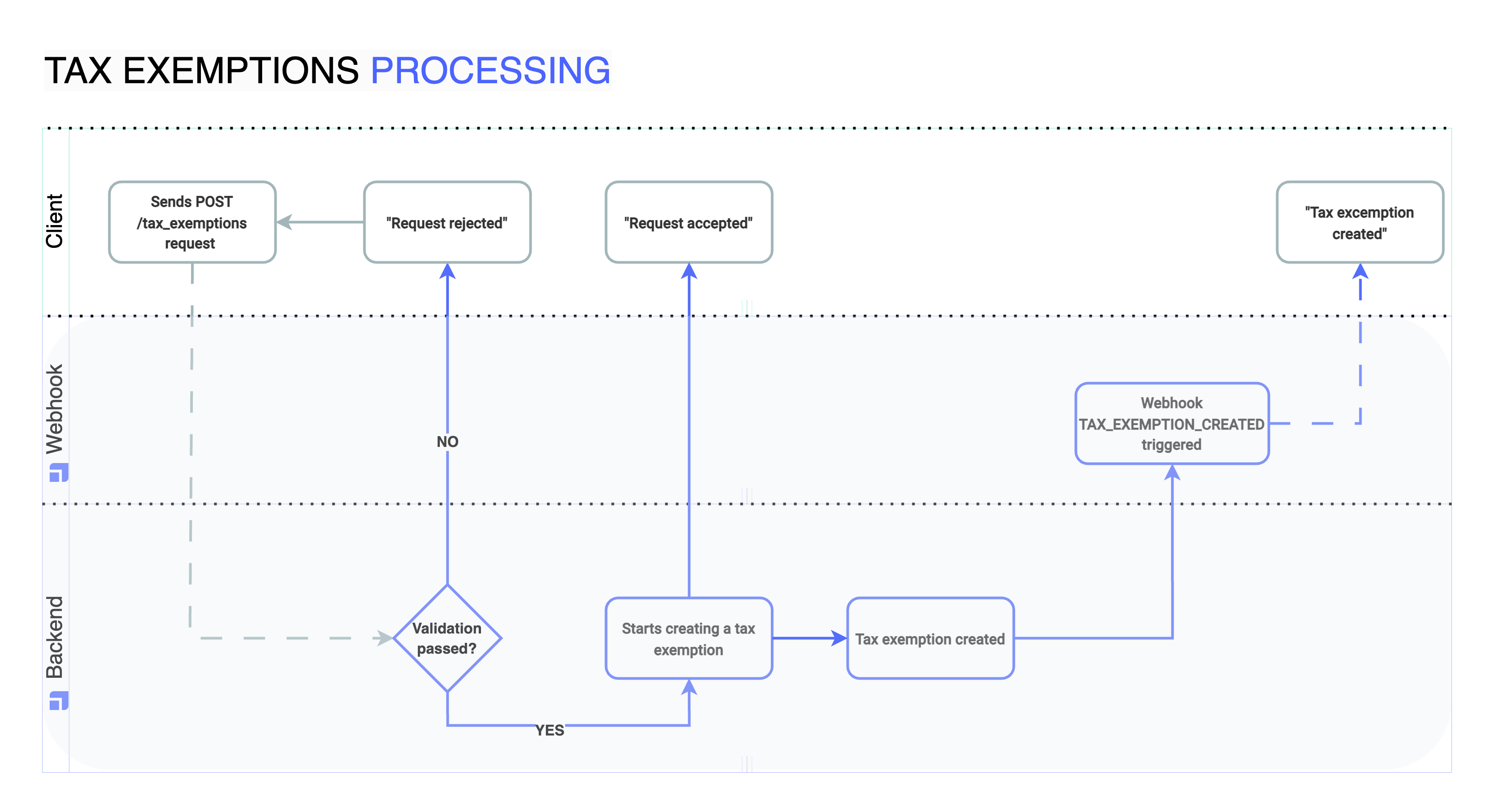 In general, all tax exemption requests will return a response that indicates whether the request has been accepted for processing. The final result of the processing is returned asynchronously. Each HTTP response contains the ID of the tax exemption.